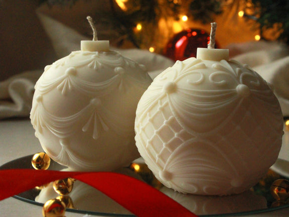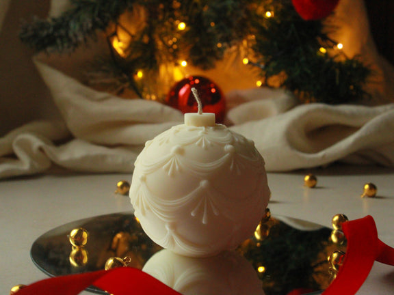 Un’elegante candela sferica in cera di soia naturale, colata a mano e impreziosita da delicati rilievi che ricordano i drappeggi delle classiche decorazioni natalizie.