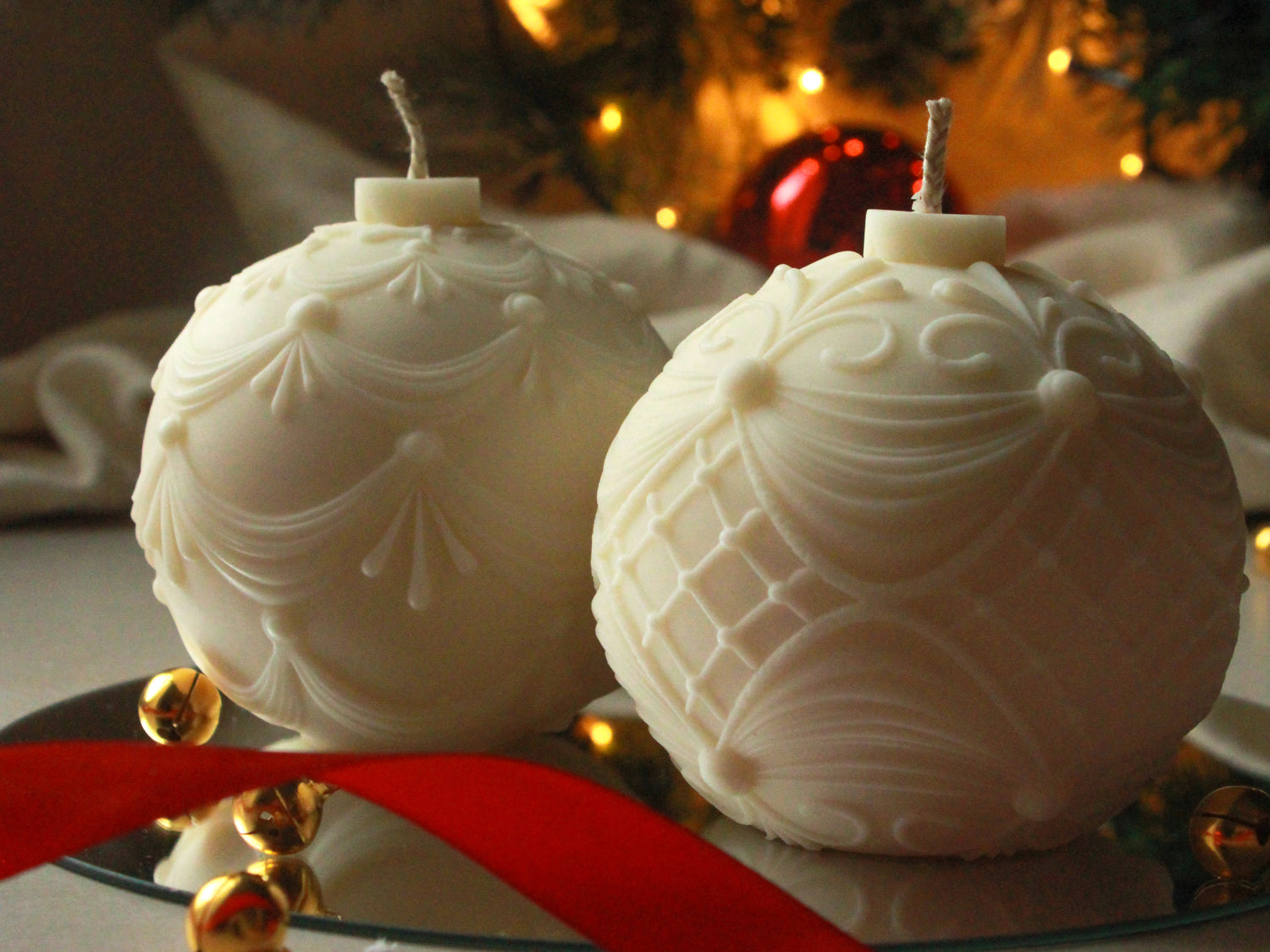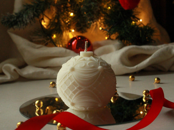 Candela artigianale in cera di soia naturale, colata a mano e modellata in una sfera dal design geometrico ispirato alle sfaccettature del cristallo.
